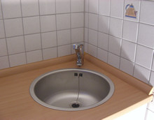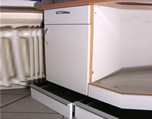 Renovierung von Küchenmöbeln: Austausch von Fronten und Arbeitsplatten. Hier weiße Fronten, Arbeitsplatte in Buche - Dekor. Oberfläche Kunststoff. < zurück >