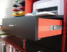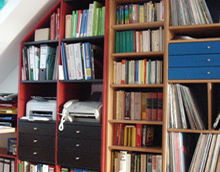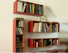 Regale mit Auszügen aus durchgefärbter (schwarz+rot), farbig lackierter oder klar lackierter MDF-Platte. < Bücher, Platten und CD -Regal - hier klicken >